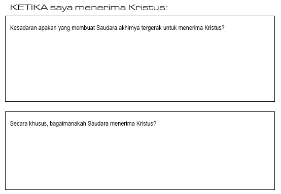 * Kehidupan Saudara sesudah mengenal Kristus (perubahan yang telah/sedang terus terjadi, arti Kristus bagi Saudara saat ini).