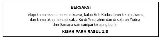 Tetapi kamu akan menerima kuasa, kalau Roh Kudus turun ke atas kamu, dan kamu akan menjadi saksi-Ku di Yerusalem dan di seluruh Yudea dan Samaria dan sampai ke ujung bumi. (KISAH PARA RASUL 1:8 )