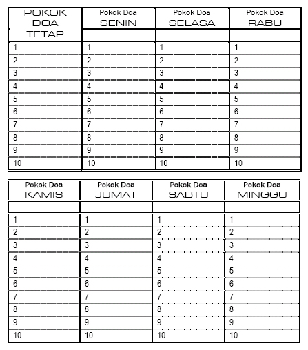 Daftar nama untuk didoakan agar mereka membuka hati kepada Kristus. Meliputi orang dekat, wilayah yang lebih luas, ujung-ujung bumi.