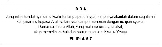 Janganlah hendaknya kamu kuatir tentang apapun juga, tetapi nyatakanlah dalam segala hal keinginanmu kepada Allah dalam doa dan permohonan dengan ucapan syukur. Damai sejahtera Allah, yang melampaui segala akal, akan memelihara hati dan pikiranmu dalam Kristus Yesus. (FILIPI 4:6-7 )