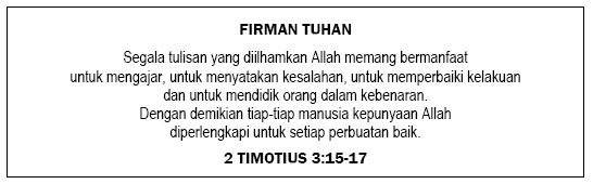 Segala tulisan yang diilhamkan Allah memang bermanfaat untuk mengajar, untuk menyatakan kesalahan, untuk memperbaiki kelakuan dan untuk mendidik orang dalam kebenaran. Dengan demikian tiap-tiap manusia kepunyaan Allah diperlengkapi untuk setiap perbuatan baik. (2 TIMOTIUS 3:16-17 )