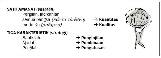 ), “diubah serupa dengan gambar-Nya" (2Kor 3:18 ), “mencapai tingkat pertumbuhan yang sesuai dengan kepenuhan Kristus” (Ef 4:13 ).Ini adalah sasaran dari suatu pelayanan yang mengikuti tuntutan Amanat Agung: mentransformasikan seseorang menjadi pelajar dan pegikut Kristus yang hidupnya mencerminkan pengajaran dan kehidupan Kristus (kualitas: murid Kristus) serta secara aktif berusaha membangun karakteristik tersebut pada orang lain di mana dia berada dan ditempatkan (kuantitas: semua ethne).