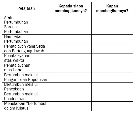Bagikanlah kebenaran-kebenaran dalam ”Bertumbuh dalam Kristus” yang telah Saudara terima kepada orang lain. Selain benih kebenaran tersebut akan berlipatganda di dalam diri orang lain, Saudara sendiri akan mengalami pertumbuhan yang jauh lebih pesat dalam pemahaman dan penerapan kebenaran-kebenaran tersebut, dibandingkan dengan jika Saudara hanya menyimpannya bagi diri sendiri. Carilah kesempatan untuk mengajarkannya kepada orang sampai orang tersebut belajar menerapkannya dalam hidup mereka. Saudara dapat mulai mendoakan untuk mendapatkan seorang ‘Timotius’ yang kepadanya Saudara akan membagikan seluruh pelajaran ini, sedemikian hingga dia dapat mengajarkannya pada orang yang lain lagi. Pergunakanlah lembar kerja ”Jurnal Projek Timotius” sebagai catatan.