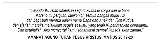 Kalimat induk ”Jadikanlah semua bangsa murid-Ku” merupakan satu amanat dengan tiga karakteristik, sebagaimana diketahui dari tiga kata kerja dalam anak kalimat yang menerangkannya: baptislah, ajarlah, pergilah. Amanat Agung dalam Matius 28:18-20