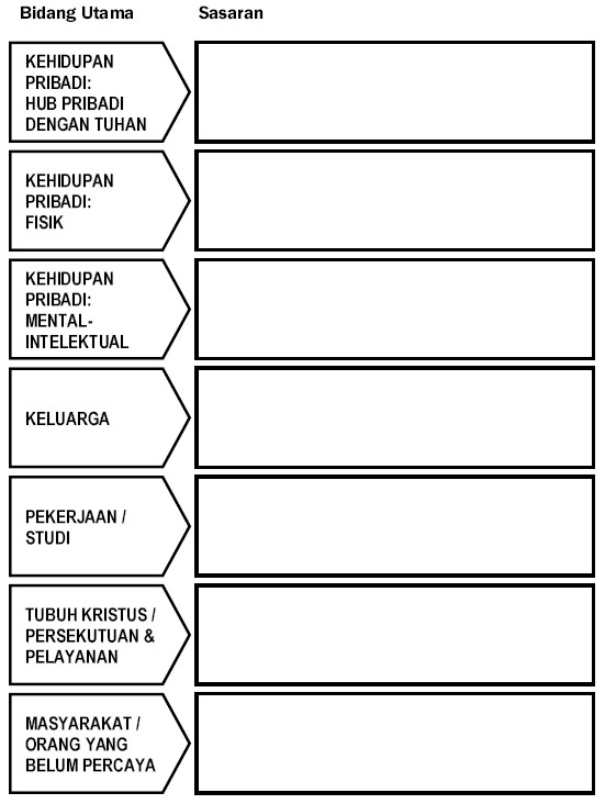 3. Tentukanlah sasaran hal-hal yang akan dikerjakan dari bidang-bidang utama kehidupan secara mingguan dengan menggunakan lembar kerja ”Jurnal Penatalayanan Waktu: Kairos”.