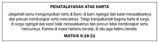 Janganlah kamu mengumpulkan harta di bumi; di bumi ngengat dan karat merusakkannya dan pencuri membongkar serta mencurinya. Tetapi kumpulkanlah bagimu harta di sorga; di sorga ngengat dan karat tidak merusakkannya dan pencuri tidak membongkar serta mencurinya. Karena di mana hartamu berada, di situ juga hatimu berada. (MATIUS 6:19-21 )